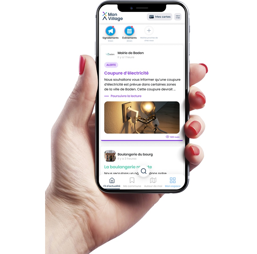Mon Village est une application mobile qui centralise l’actualité locale des communes et qui met à disposition un éventail de services aux habitants et visiteurs. Chaque inscrit reçoit, en temps réel, sur son téléphone, les actualités de la Mairie, des associations et des commerces de Baden ainsi que des communes environnantes dont il souhaite connaître l’actualité.