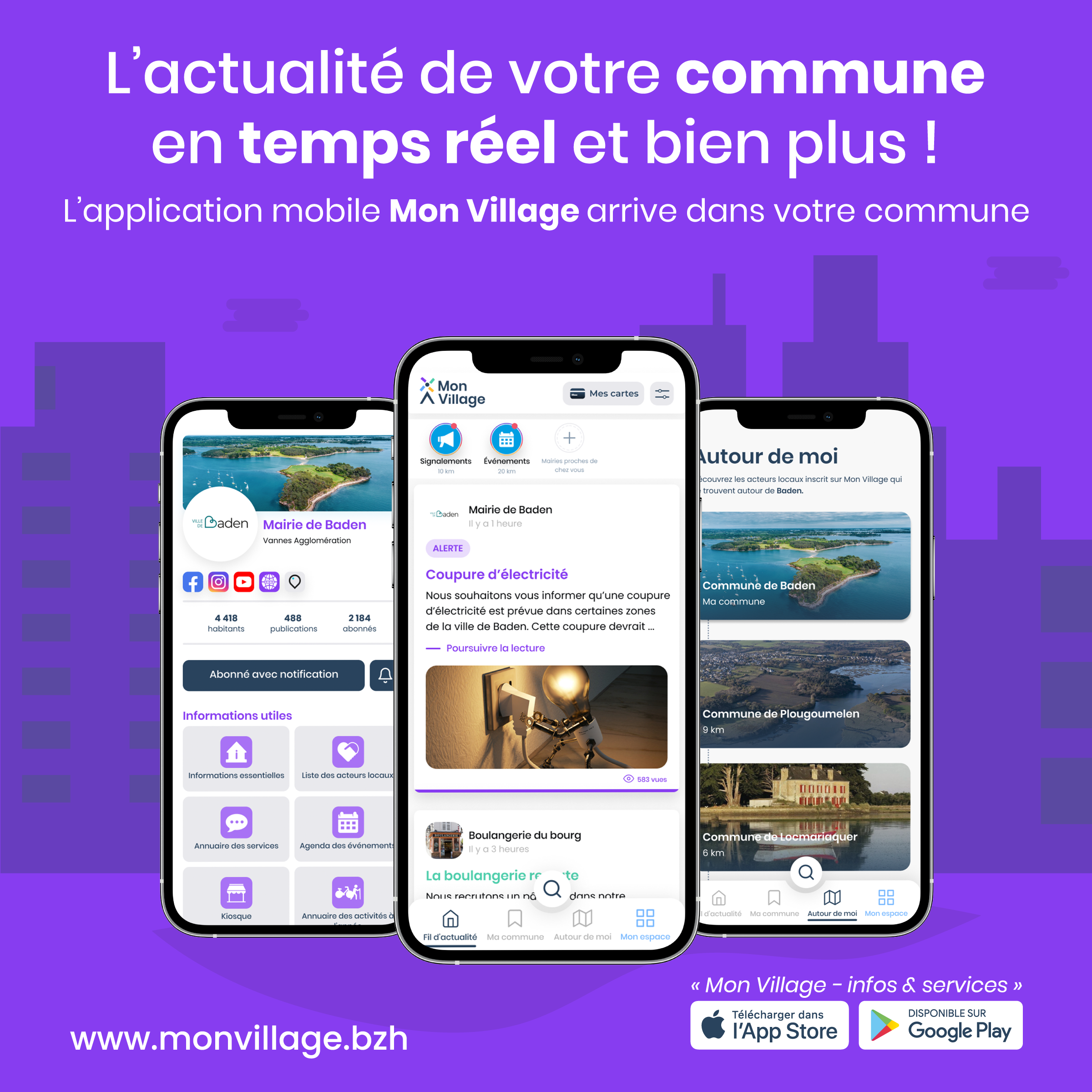 Conçue comme un service d’utilité publique, l’application Mon Village permet la circulation d’une information claire, rapide et efficace sur Baden. Canal de communication de référence entre la Mairie, les associations, les commerces, les habitants et les visiteurs, Mon Village offre une portée locale, sans précédent.